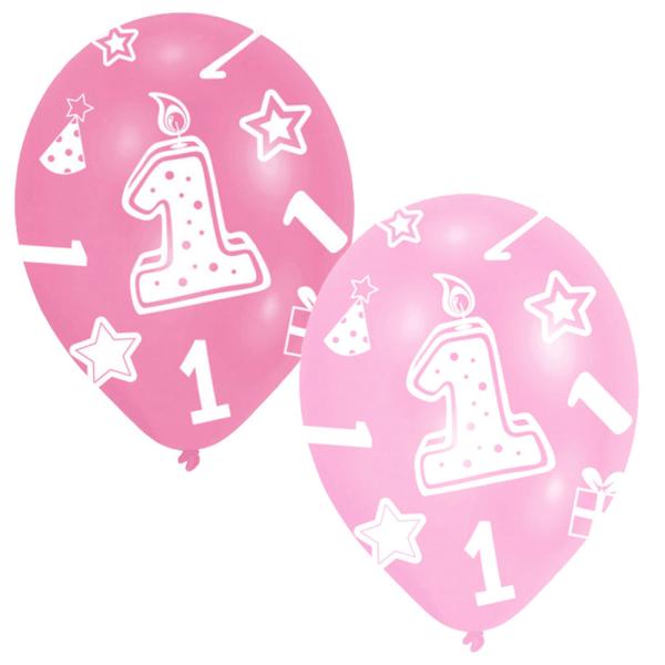 1-års Fest Balloner Metallic Pink indeholder 6 balloner i metallic lyserød og metallic pink med hvidt motiv af et lys i form af et ét-tal, samt hvide motiver af gaver, stjerner, festhatte og cirkler.
