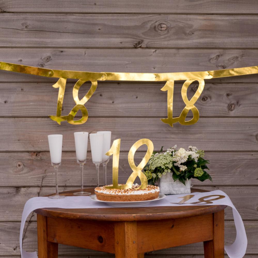 18-års Guirlande Metallic Guld omfatter en papirguirlande med en glinsende guldfarvet forside. Guirlanden er cirka 20 cm høj og 250 cm lang. Hæng den op med dit valgte snor.