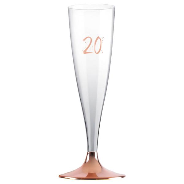 Skål på 20-årsdagen med disse fine genanvendelige champagneglas af plastik! Smukke plastikglas med en rosaguld fod og 20 tekst i rosaguld, der gør dem perfekte til alle, der ønsker at fejre 20-årsdagen med bobler eller champagne. Dæk op med glassene på bordet eller del dem ud til alle gæsterne, når det er tid til at skåle. Fine genanvendelige bobleglas af plastik, der passer perfekt til enhver 20-års fest i et rosaguld farvetema.