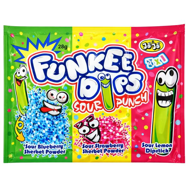 Klassikeren jordbærslik spreder smil, mens blåbærslik overrasker og citronslik giver et frækt twist. Dette slik forener blåbær med jordbær og frisk citron, hvor et kildrende pulver gør smagen sur og indbyder til dyp. Med dyp bliver slikket sjovere.