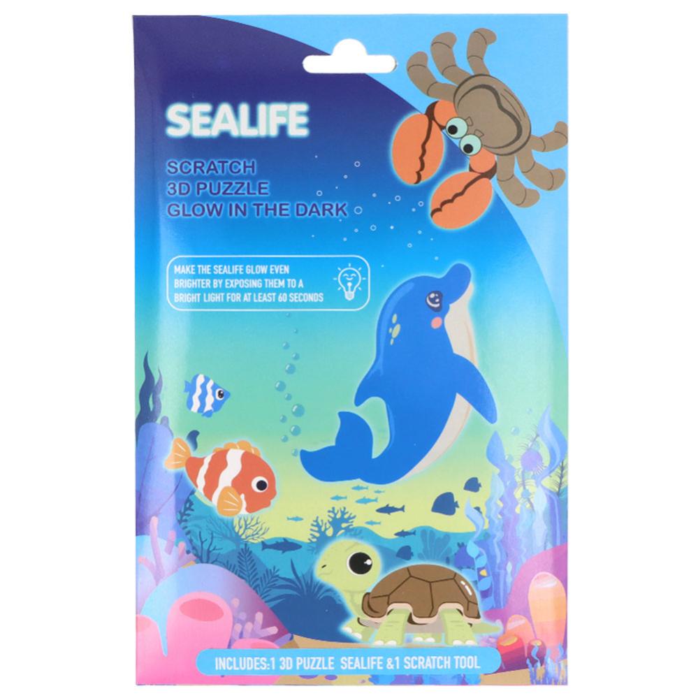 3D Skrabe Puslespil Havliv er et 3D-puslespil med skrabeeffekt, hvilket betyder, at du først skraber brikkernes farver frem, ligesom en skrabelod. Derefter samler du nemt brikkerne til en stående 3D-figur. Skrabeværktøj medfølger. Puslespillet findes i fire forskellige varianter, som forestiller dyr, der lever i havet, hvilket dyr du får bliver en overraskelse. Figuren kan også lyse i mørket ved at blive udsat for stærkt lys i mindst 60 sekunder.