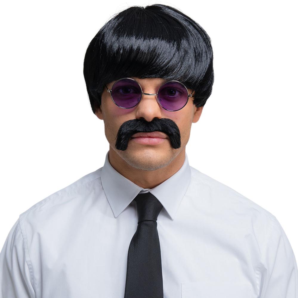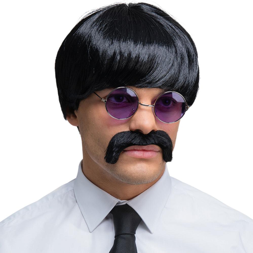 60'er Popikon Paryksæt omfatter et sæt med en ikonisk sort 60'er paryk og et sort overskæg i hvalrosstil. Medfølger også et par briller med runde lilla glas og tynde sølvfarvede stel. Overskægget er selvklæbende og parykken har et luftigt netfor som hjælper med at holde den på plads.