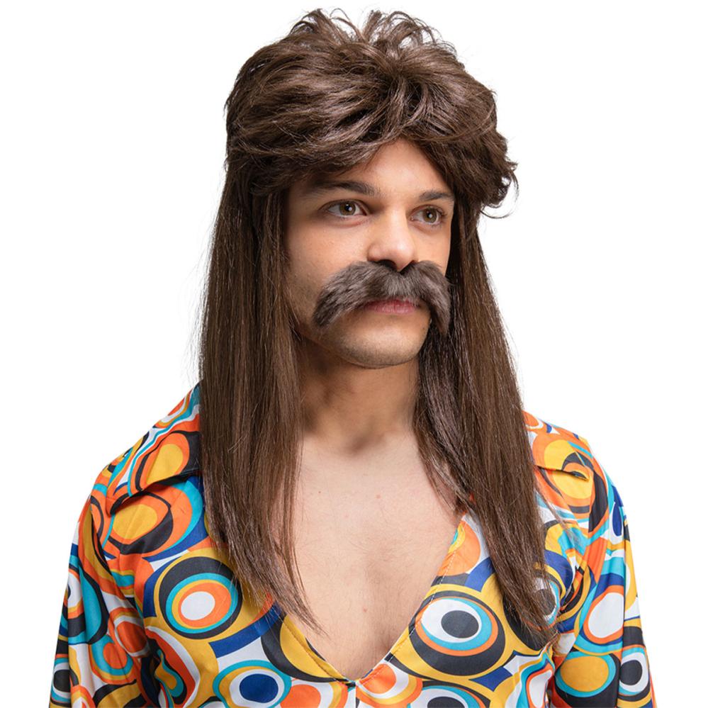 70'er Paryksæt Mørkebrun er et komplet udklædningssæt for dig der vil skille dig ud til en 70'er temafest. Med en klassisk hockeyhårsparyk og selvklæbende overskæg får du et fuldendt mullet paryk-look.