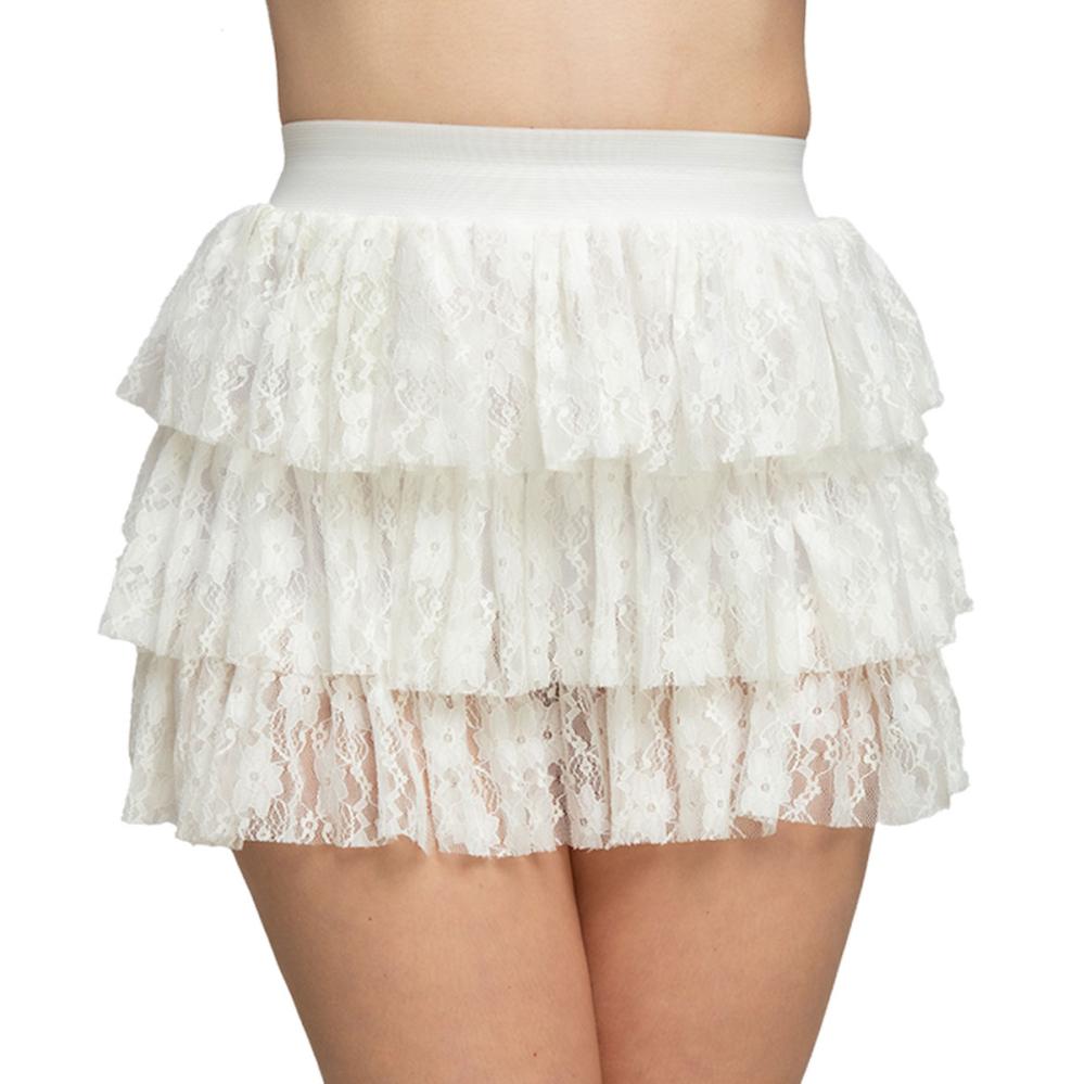 Giv din 80'er-udklædning en ekstra touch med denne korte hvide nederdel med tre lag med flæser. Nederdelen er perfekt til 80'er-fester, maskerader og alle lejligheder, hvor en hvid blondenederdel løfter stilen.