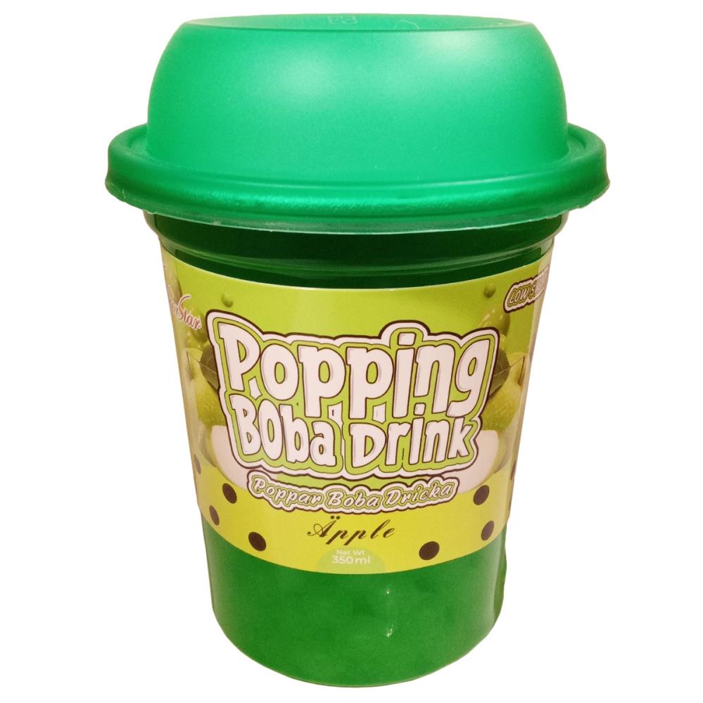 Æbledrik med Popping Boba 350 ml er en æbledrik med popping boba i et plastbæger på 350 ml med et papirsugerør.