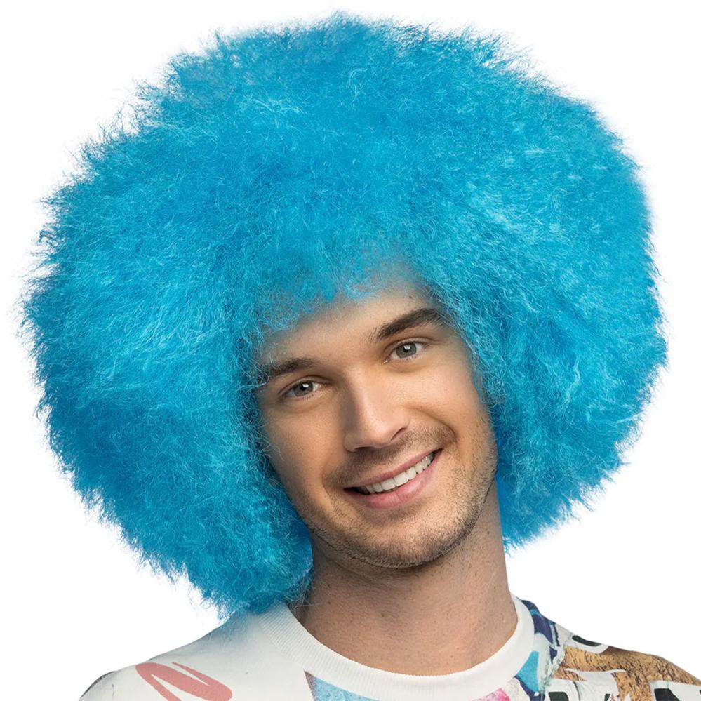 Afroparyk Neonblå omfatter en stor, blød og luftig paryk i en neonblå farve.