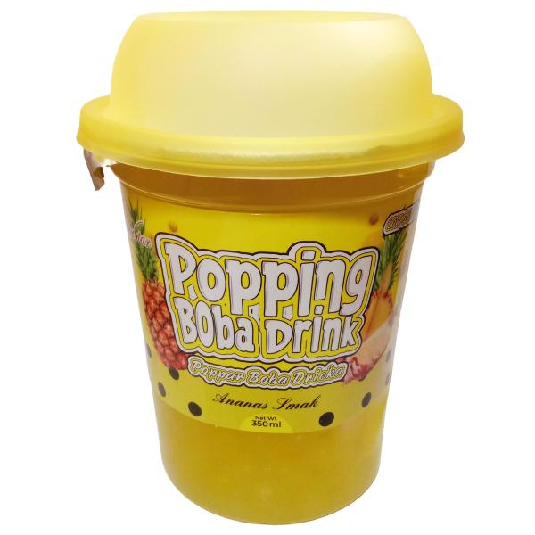 Ananasdrik med Popping Boba 350 ml er en ananasdrik med popping boba i et plastkrus på 350 ml med et papirssugerør.