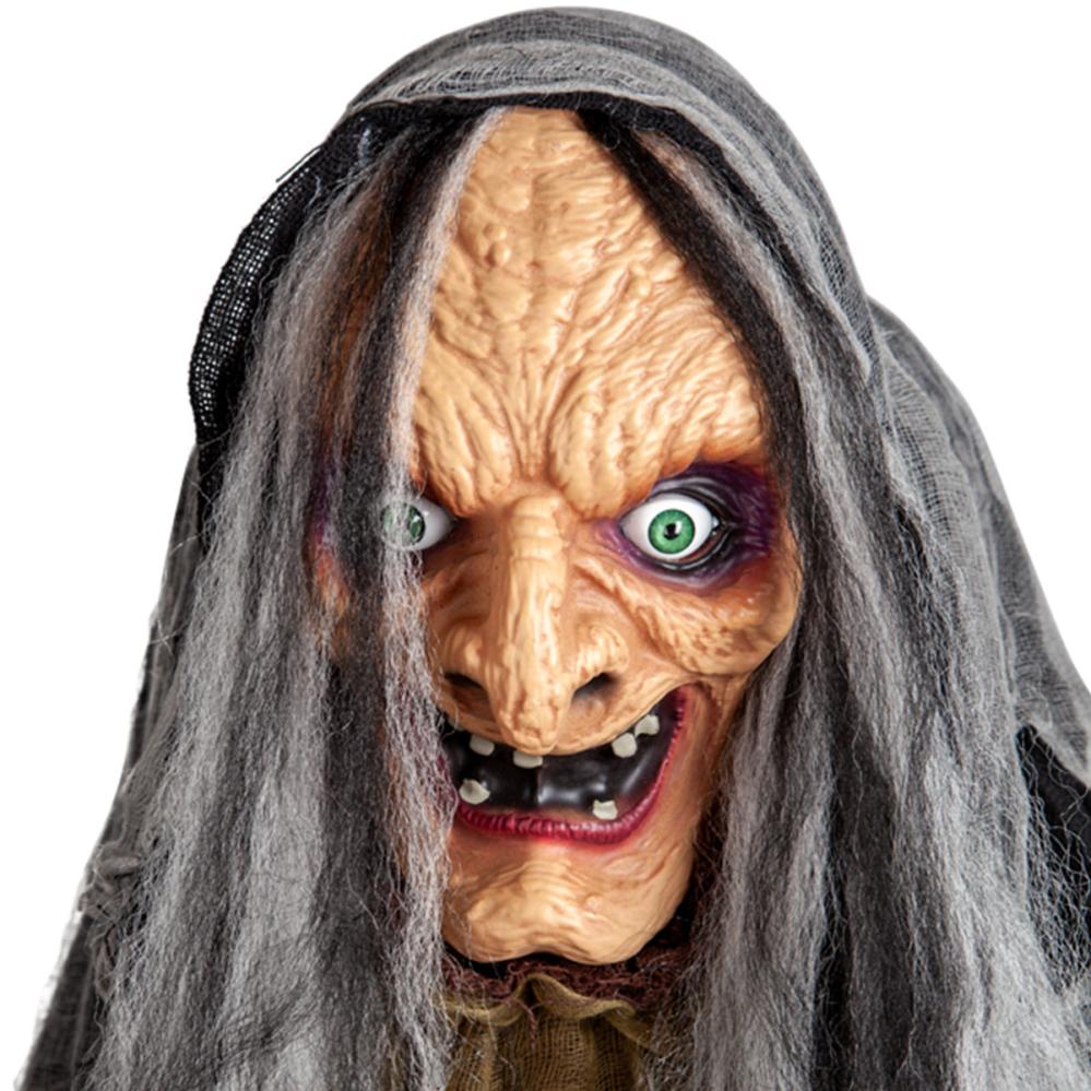 Skræm halloweenfejringen op med en animatronisk Halloween-rekvisit som virkelig bemærkes. Denne animerede heks, en Halloween-dekoration, bevæger sig, lyser og griner ondskabsfuldt. Dette er en perfekt Halloween-rekvisit og halloweendekoration med lys, lyd og bevægelse.