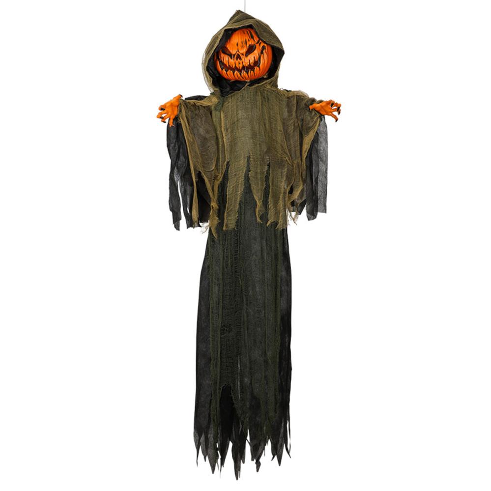 Animeret Hængende Græskarmand 200 cm omfatter en hængende halloweendekoration i form af en græskarmand med lys, lyd og bevægelse. Figuren har et ondsindet græskarsmil, en lang, grøn og iturevet kappe samt udstrakte kløer. Ved aktivering lyser ansigtet og hænderne op samtidig med, at den afgiver uhyggelige lydeffekter.