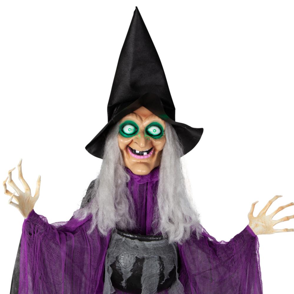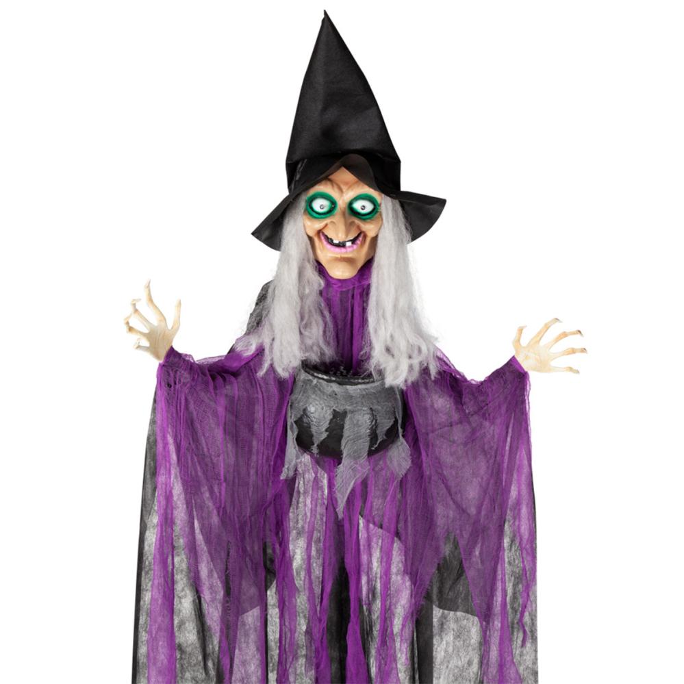 Animeret Hængende Heks 183 cm omfatter et hængende Halloween-rekvisit, der forestiller en heks, som laver lyde, lyser og bevæger sig. Heksen leveres komplet med en lille gryde, skeletlignende hænder, langt hvidt hår, en klassisk spids hat og en laset kappe i lilla og sort. Ved aktivering vækkes denne uhyggelige heks til live med blinkende grønne øjne, bevægelige arme og et ondskabsfuldt grin.