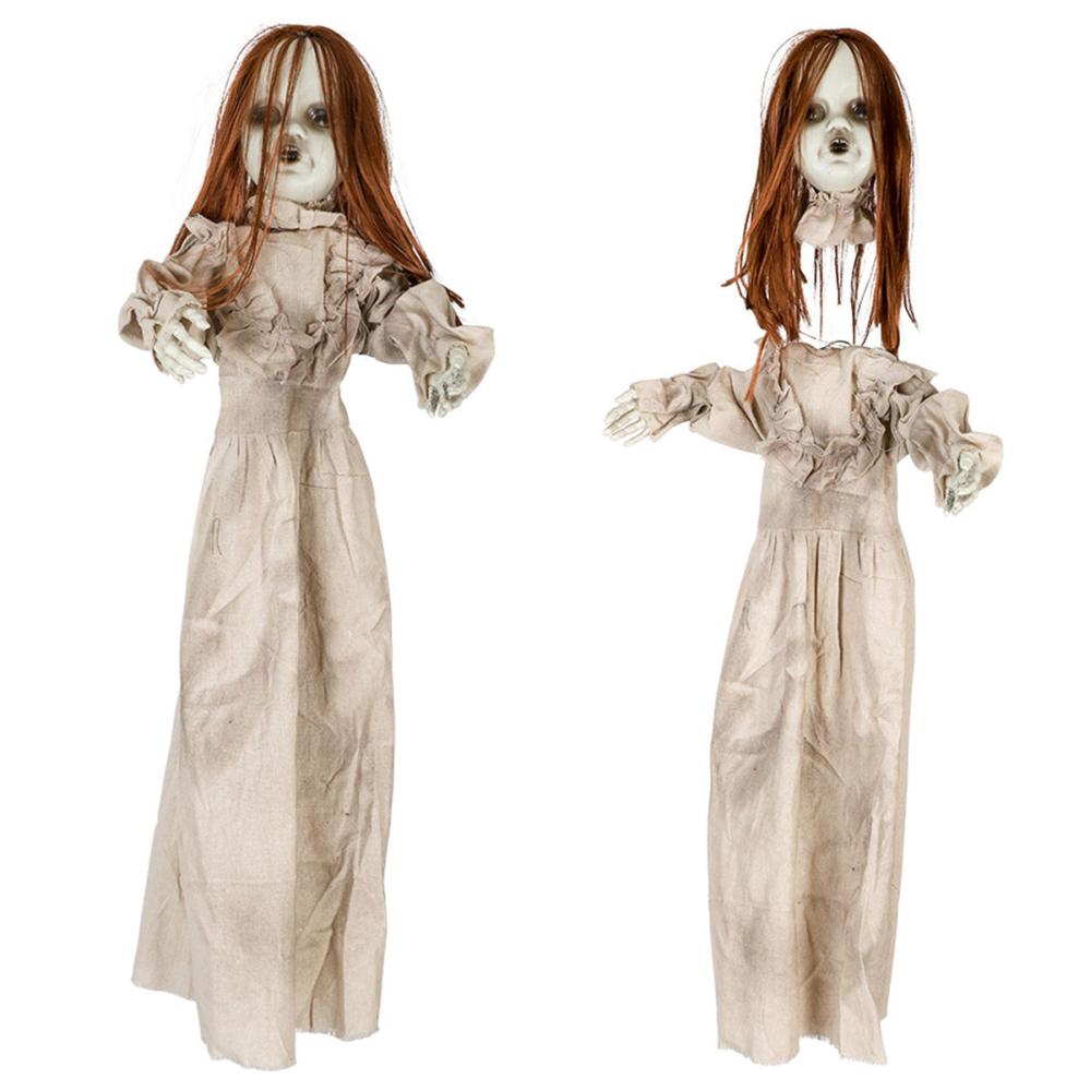 Animeret Hængende Skrækdukke Prop 110 cm er en hængende halloweendekoration, der forestiller en skræmmende dukke med bevægelse, lys og lyd. Dukken har et naturtro udseende med langt pjusket hår, et blegt ansigt og en slidt hvid kjole. Ved aktivering svæver dukkens hoved op, giver fra sig uhyggelige lyde og lyser op.