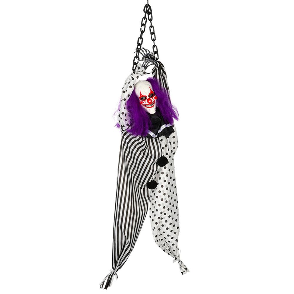 Animeret Rystende Klovn i Lænker 100 cm omfatter en hængende halloweenfigur med bevægelse, lyd og lys i form af en uhyggelig klovn. Figuren hænger i lænker, har lilla hår, rød klovnesminke og er klædt i en klassisk sort-hvid klovnedragt. Ved aktivering ryster klovnen ukontrolleret, udsender uhyggelige lyde og blinker med lysende øjne.