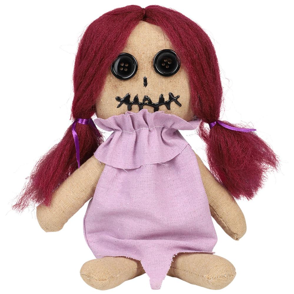 Animeret Uhyggelig Dukke Prop er en batteridrevet halloweenfigur med bevægelses- og lydeffekter, der forestiller en skræmmende dukke. Dukken har sorte knapøjne og vinrødt hår og bærer en rosa kjole. Den er udstyret med lydsensor og ved aktivering begynder dukken at græde samtidig med at den bevæger sig op og ned.