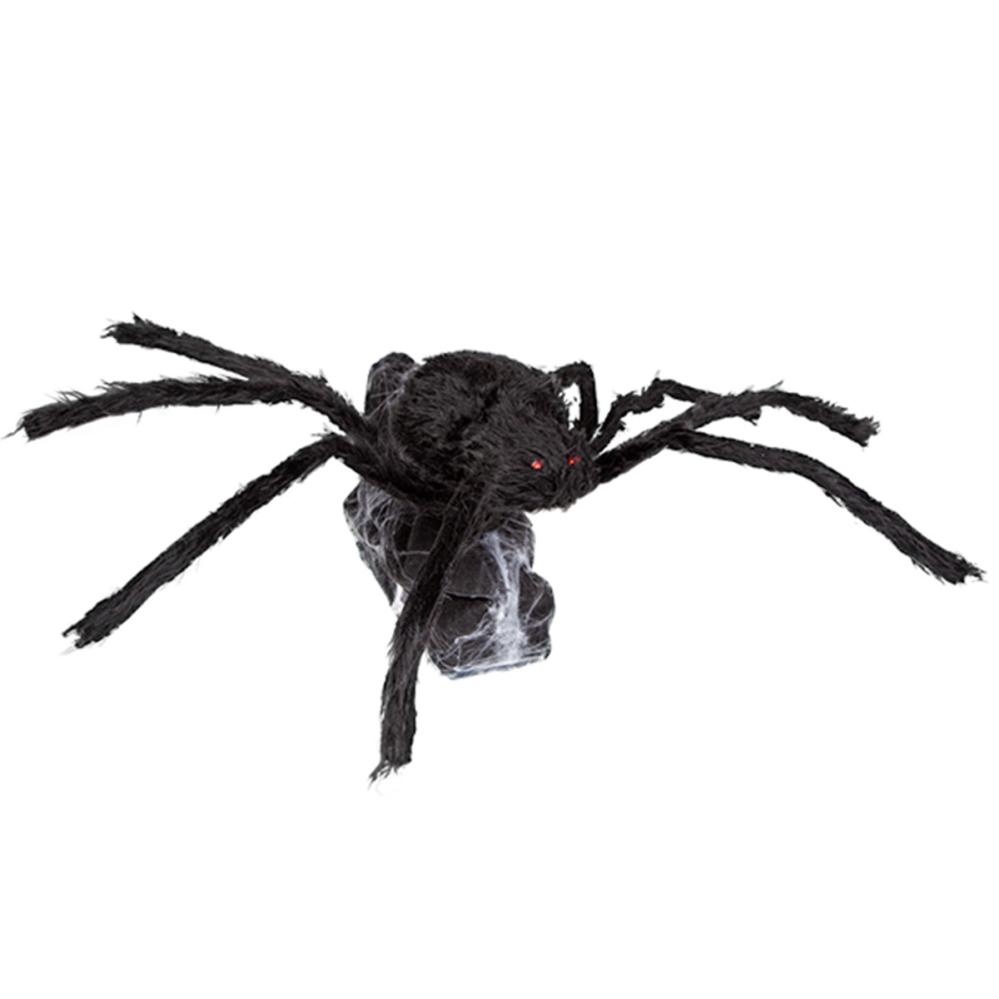 Animeret Uhyggelig Hoppende Edderkop 70 cm omfatter en Halloween-rekvisit med lydaktivering som forestiller en stor, behåret sort edderkop med lyd, lys og bevægelse. Edderkoppens ben er formbare og den sidder på en lille platform som er dækket med hvidt spindelvæv. Når den aktiveres kaster edderkoppen sig frem, med rødblinkende øjne og en skræmmende lyd. Derefter afspilles en kort melodi mens den langsomt trækker sig tilbage. OBS! Der er en skjult tænd/sluk-knap under spindelvævet som bruges til at slå den lydaktiverede tilstand til.