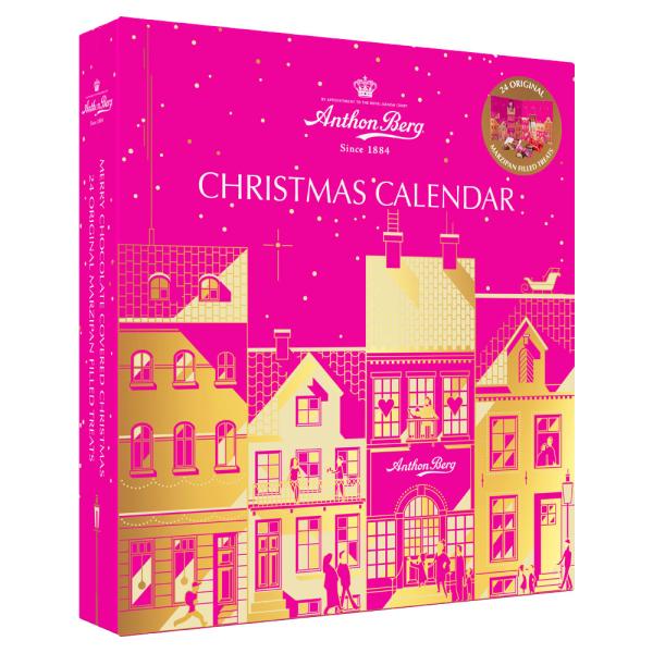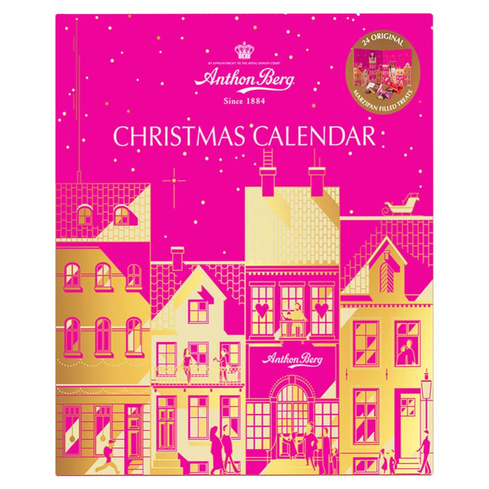 Anthon Berg Marcipan Julekalender indeholder en Anthon Berg julekalender med marcipan-chokolade i forskellige smagsvarianter. Kalenderen måler ca. 27,5 x 29,5 x 5,5 cm.