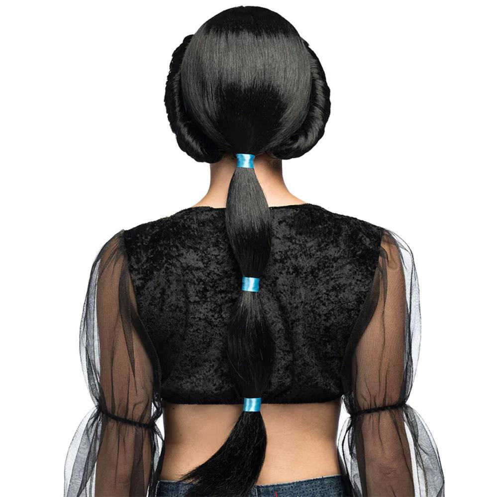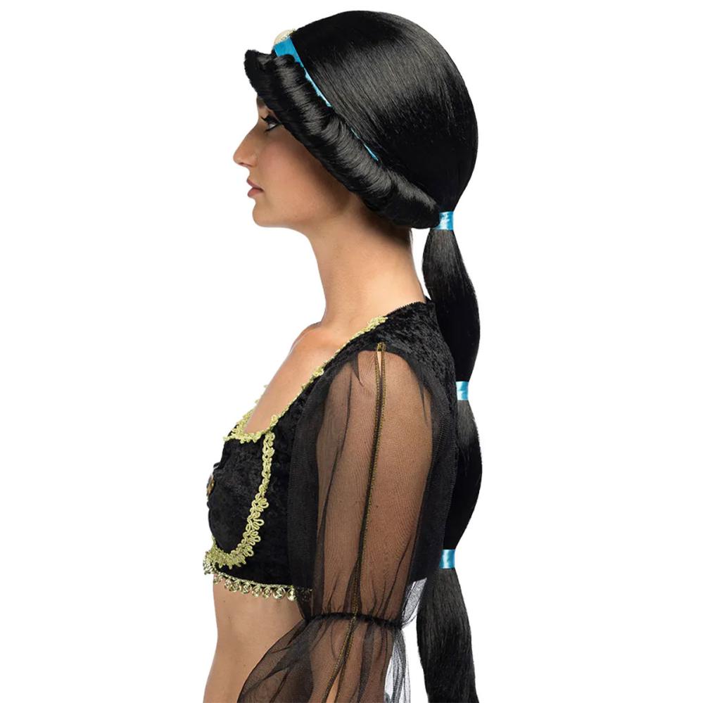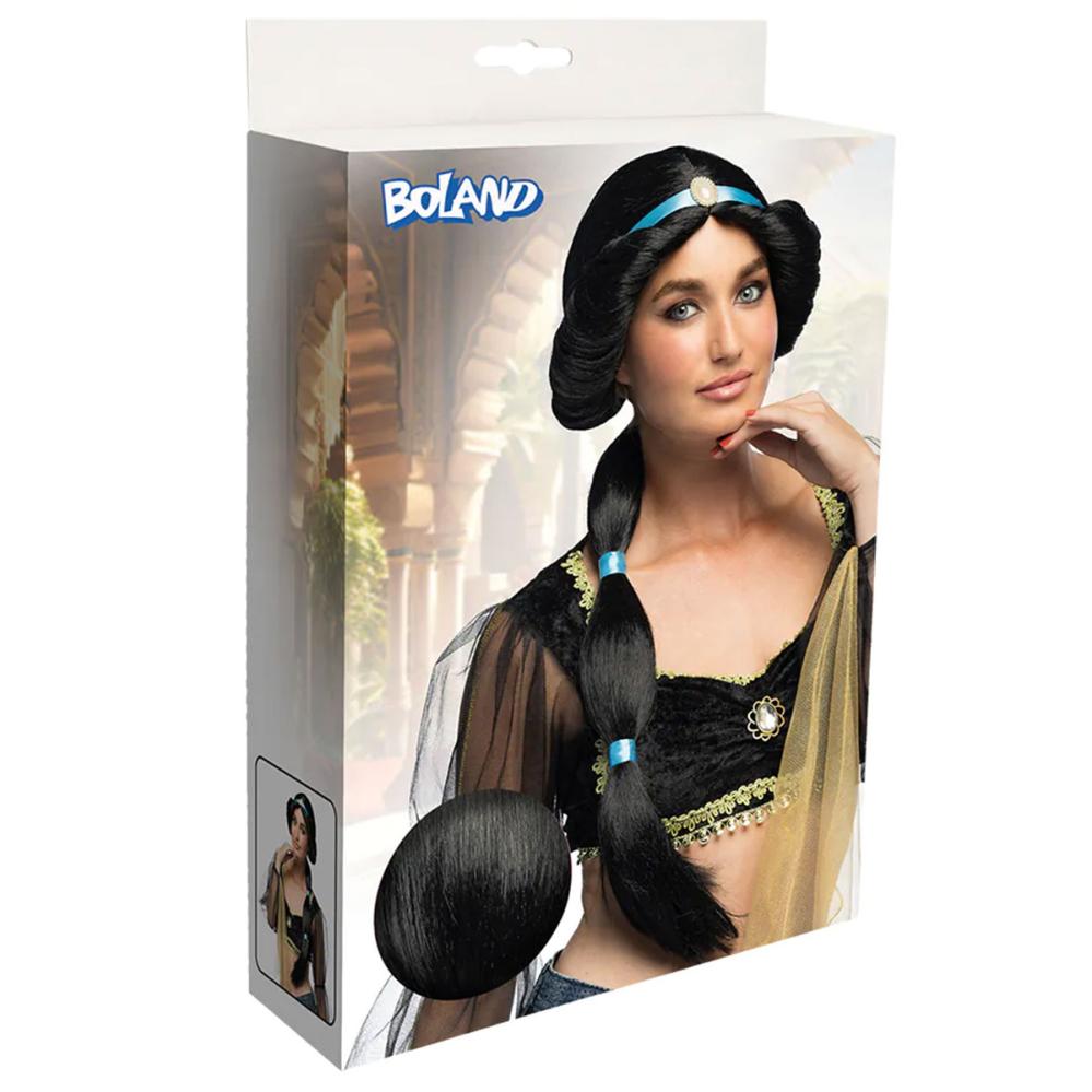 Arabisk Prinsesse Paryk omfatter en lang, sort paryk, som er karakteristisk for prinsesse Jasmins hår fra Aladdin. Parykken har blå bånd, der holder håret samlet, samt en gylden detalje foran.