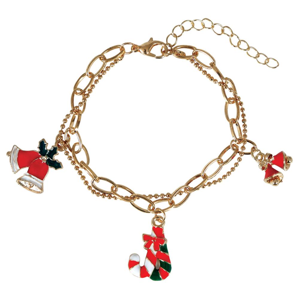 Armbånd med Julecharms omfatter et justerbart, guldfarvet metalarmbånd med tre hængende charms, der forestiller røde julek lokker og stribede polkagrise.