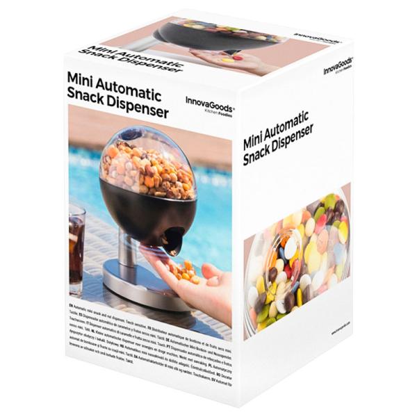 Automatisk Snackdispenser omfatter en snackdispenser, der passer til slik og nødder. Dispenseren fodrer snacks ud, når du rører ved touch-sensoren nederst. Dispenseren er lavet af plast og er ca. 12,5 x 20 cm stor.