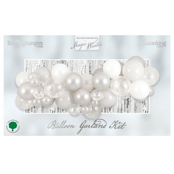 Ballon Guirlande Kit Magisk Vinter omfatter et kit med 54 balloner i hvid, sølv og transparent samt tilbehør til at skabe en ballonguirlande. Instruktioner til at samle ballondekorationen medfølger.
