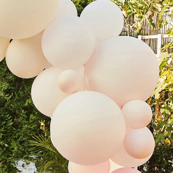 Ballonbue Sæt Nude og Lyserød indeholder et ballonbue sæt med 75 latexballoner i forskellige nuancer af lyserød og beige. Inkluderet er også instruktioner, Glue dots, ballontape og snor.