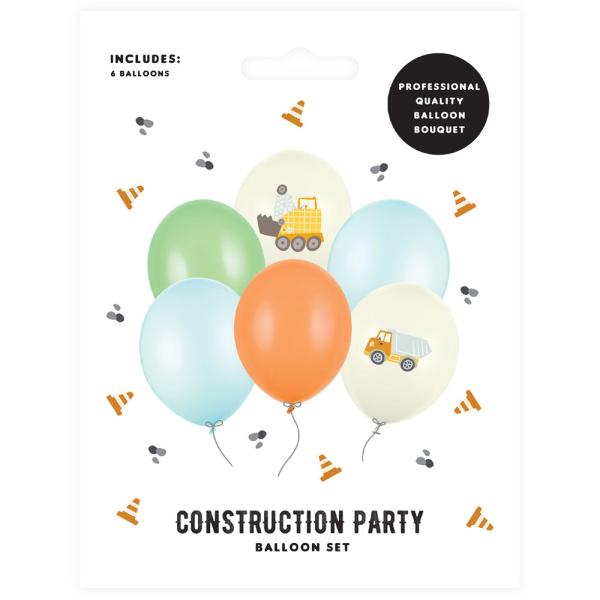 Balloner Byggekøretøj inkluderer seks balloner i farverne hvid, grøn, blå og orange med forskellige byggekøretøjer som motiv.