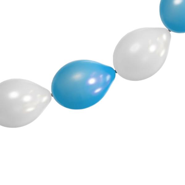 Ballongguirlande Blå og Hvid indeholder 8 blå og hvide latexballoner, som nemt kan samles til en ballongguirlande. Ballonerne fyldes med luft og bliver ca. 25 cm store. Ballongguirlanden bliver i alt ca. 3 meter lang.