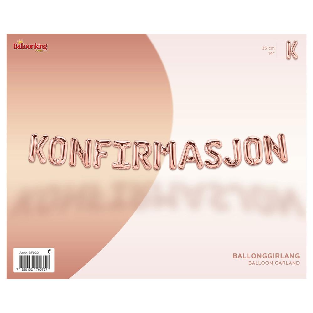 Ballonguirlande Konfirmasjon Roséguld indeholder tolv bogstavsformede folieballoner, som danner ordet "KONFIRMASJON" i roséguld. Ballonerne fyldes med luft med det medfølgende sugerør og har øjer til enkel ophængning med den snor, som medfølger.