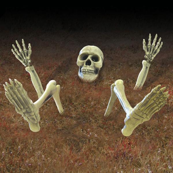 Begravet Skelet Dekoration omfatter en dekoration i form af et skelet bestående af et kranium, to arme og to ben. Dekorationen sættes i jorden med medfølgende beslag, hvilket får skelettet til at se ud som om det er på vej op fra jorden.