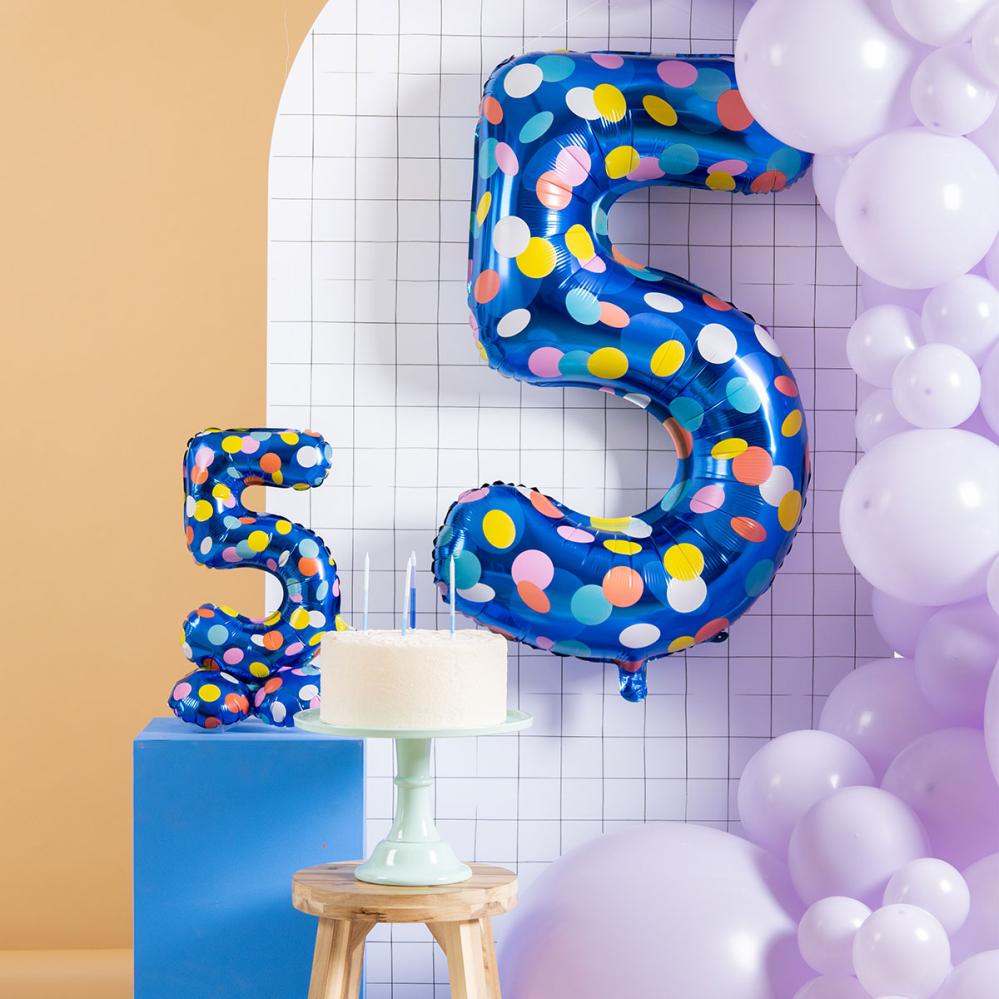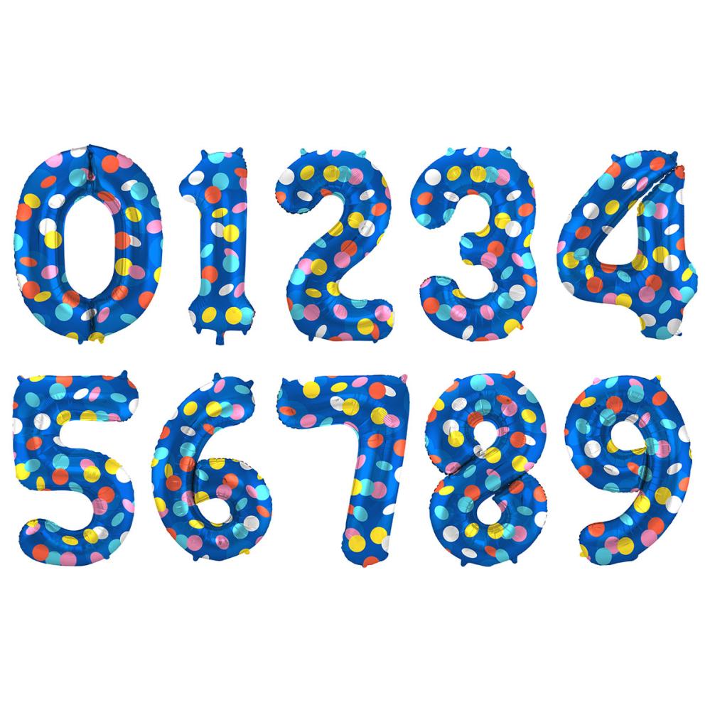 Blå Talballon med Prikker omfatter en blå folieballon i form af et tal med flerfarvede prikker.