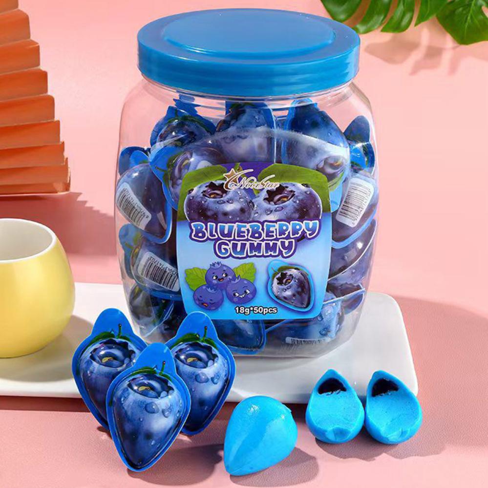 Blåbær Geléslik 18 g består af et blødt og sejt geléslikstykke med sød blåbærsmag, pakket i en lille blå plastemballage prydet med et blåbærmotiv.