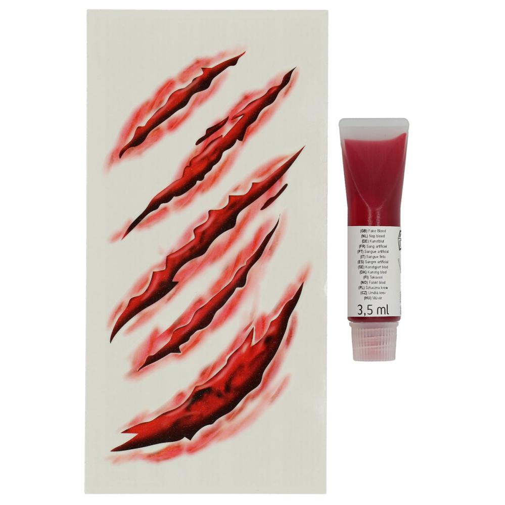 Blod- og Sårtatoveringer Sæt omfatter et sæt med fem stykker midlertidige rivsårstatoveringer og en tube med 3,5 ml rødt fakeblod.