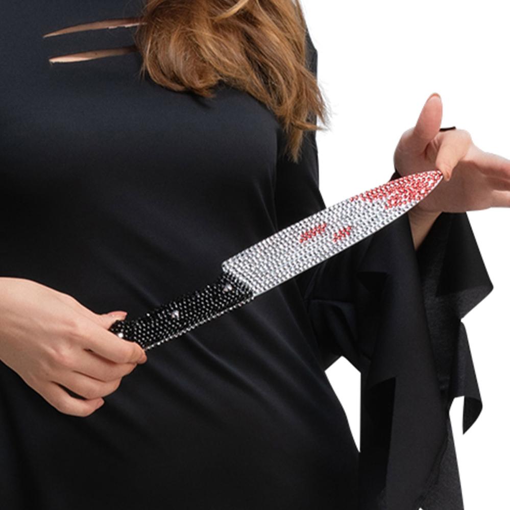 Blodig Køkkenkniv med Diamanter omfatter en attrapkniv med et håndtag dekoreret med sorte plastdiamanter samt et knivblad med sølvfarvede og røde plastdiamanter.