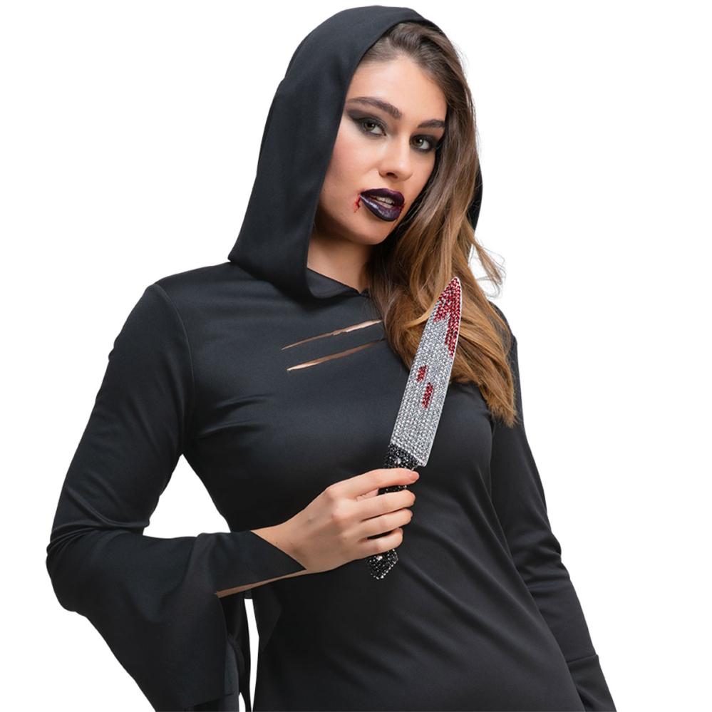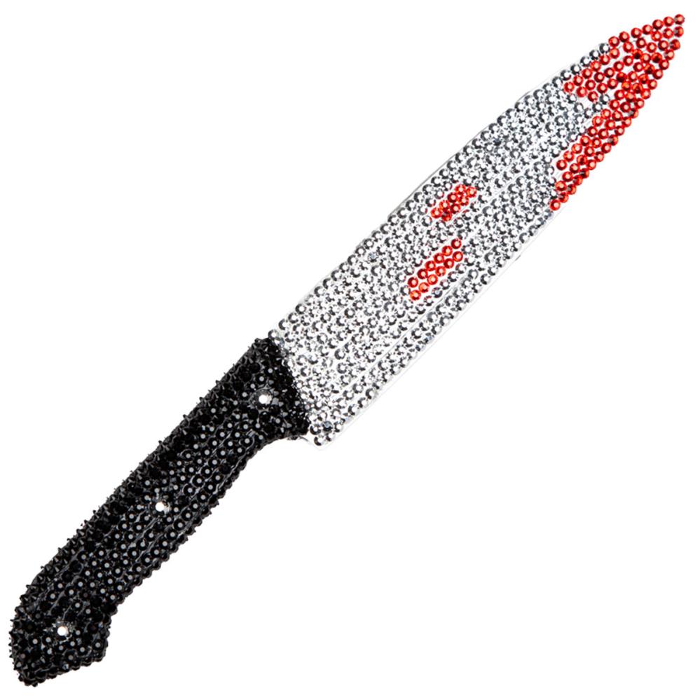 Skræm alle fra vid og sans til Halloween med en blodig kniv. En glitrende falsk kniv med røde og sølvfarvede plastdiamanter som giver illusionen af et blodigt knivblad. Perfekt attrapkniv for dig der kan lide dramatik med stil.