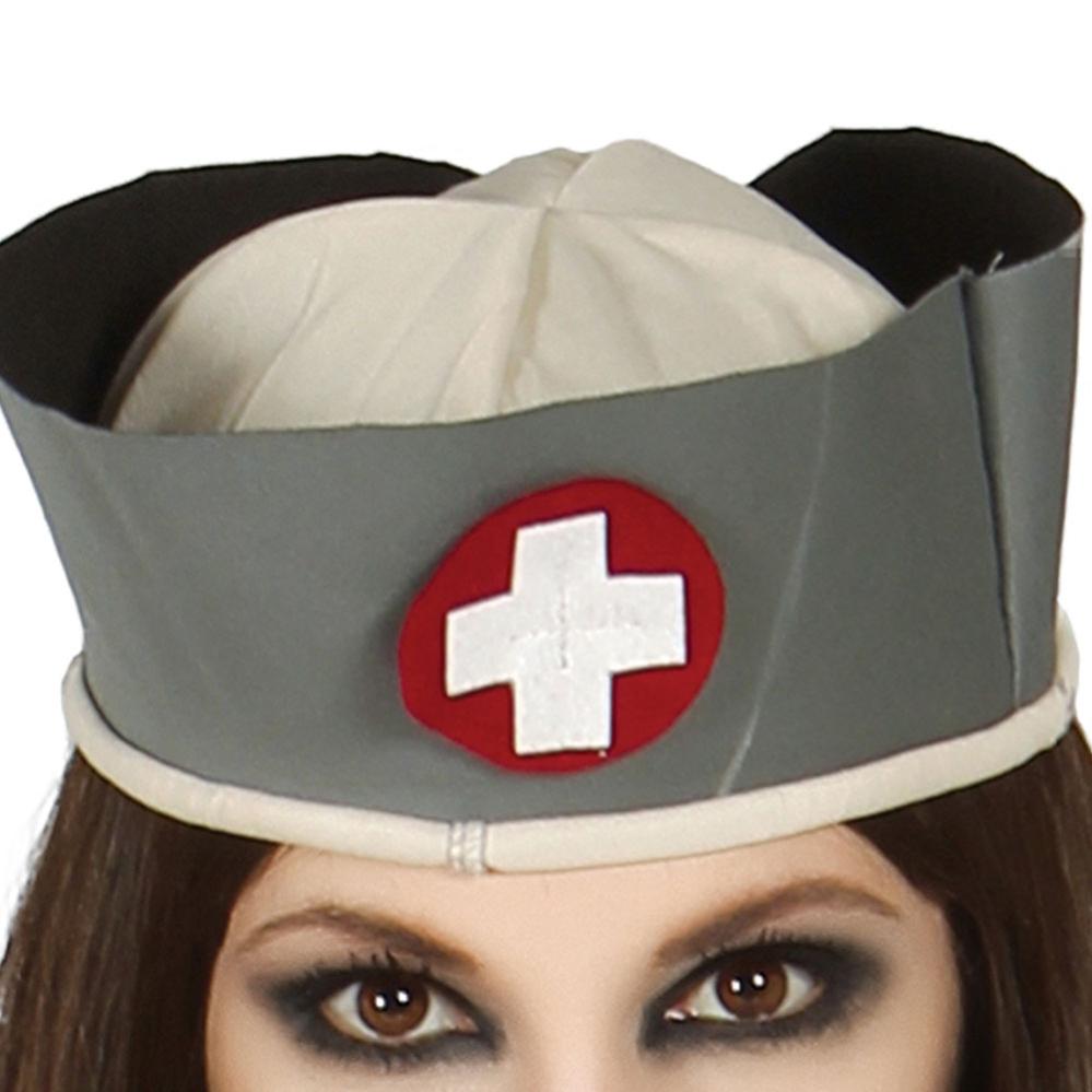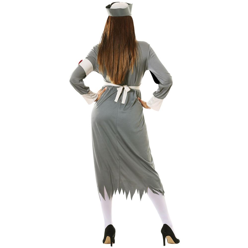 Blodig Zombie Sygeplejerske Kostume omfatter en sygeplejerskedragt med blodstænk. Dragten inkluderer en sygeplejerskehue og en gråblå kjole.