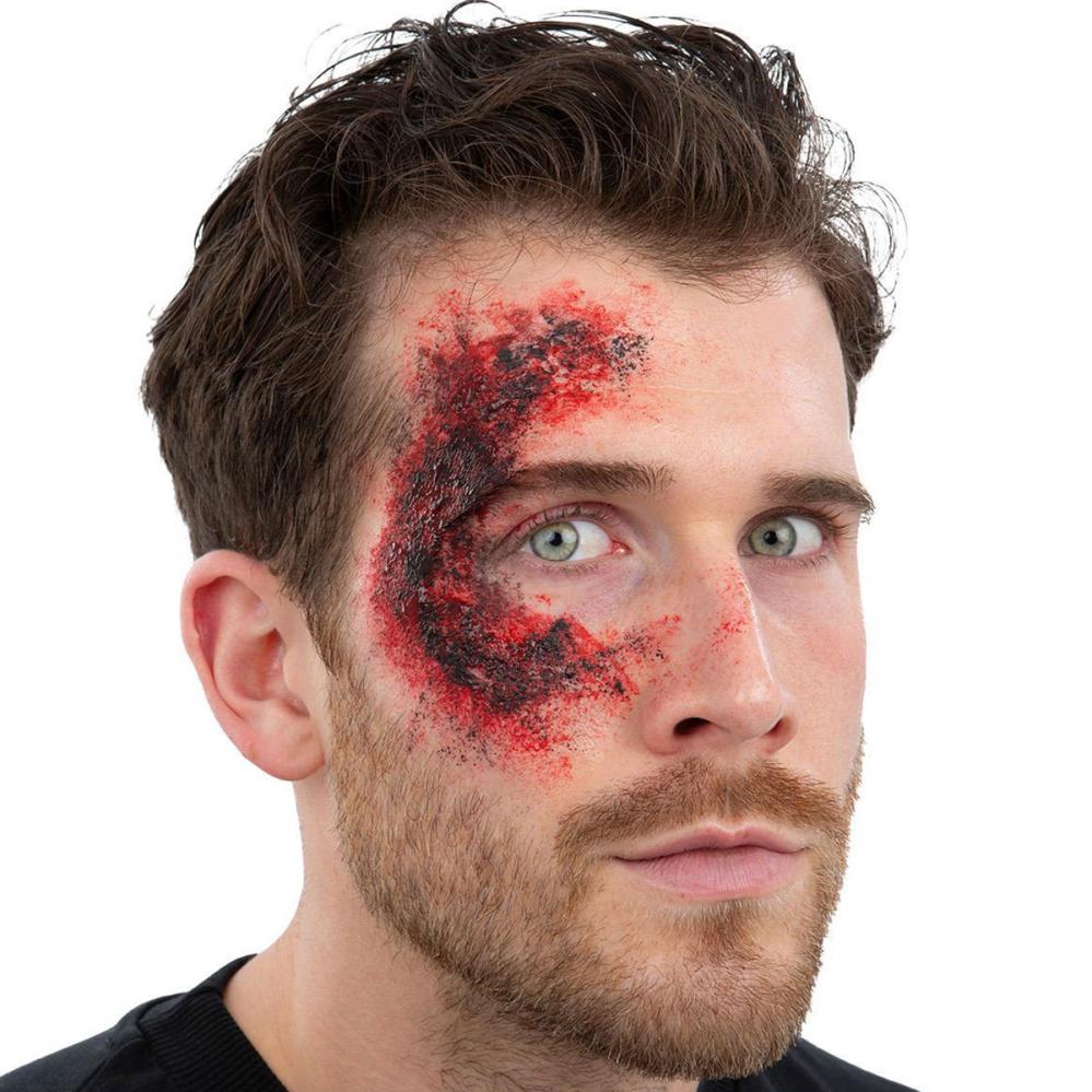 Blodigt Brandsår Sminkesæt er et kit med alt, du behøver for at skabe en realistisk hudeffekt ved en brandskade eller anden skade. Det kommer med en bøtte sårskorpeblod, en tube sort blod og en sort stoppelsvamp for nem påføring.
