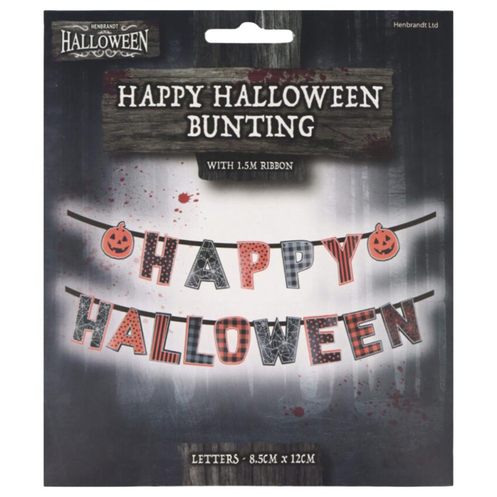 Bogstavguirlande Happy Halloween er en guirlande med bogstaver i sort, orange, hvid og grå som tilsammen danner teksten 'Happy Halloween' og den er dekoreret med to orange halloweengræskar. Bogstaverne er fastgjort på et medfølgende sort bånd for nem ophængning.