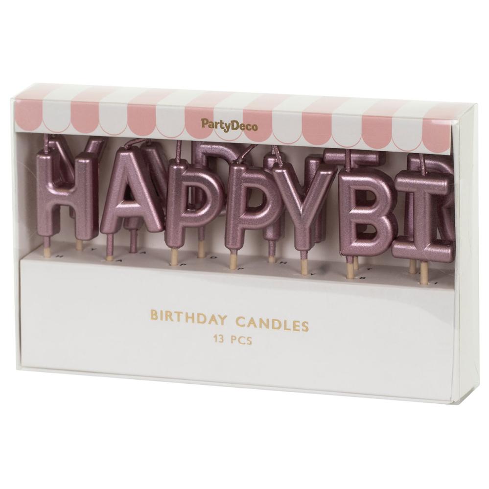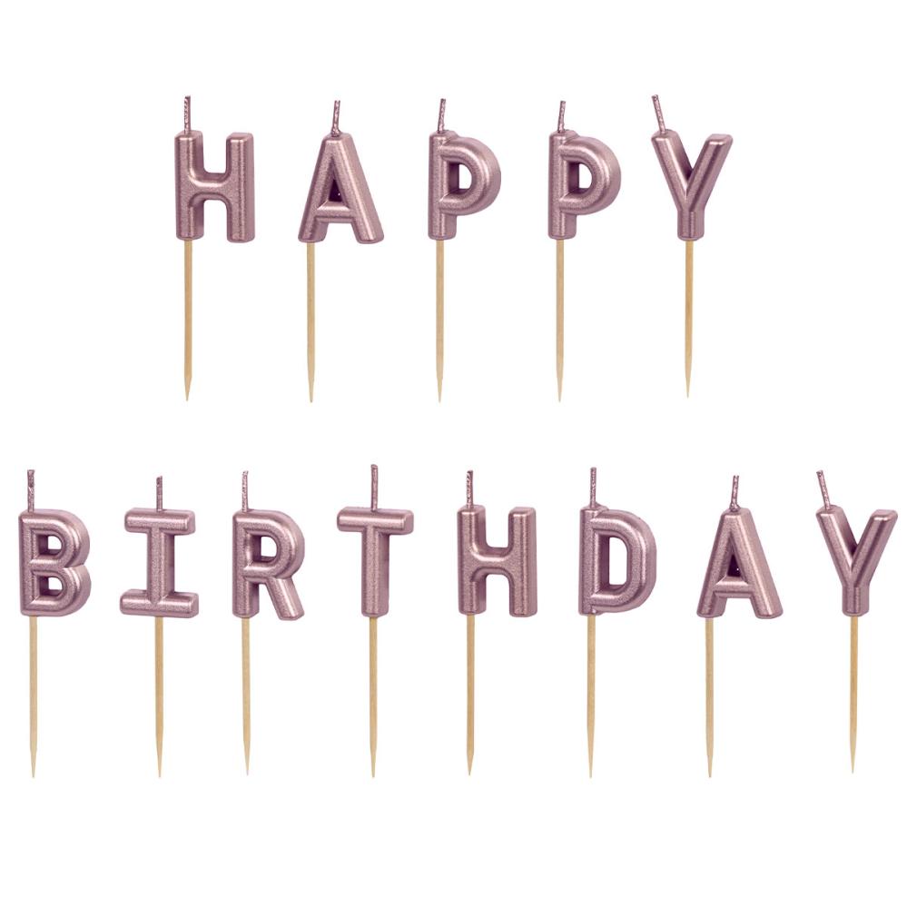 Bogstavlys Happy Birthday Roseguld består af tretten bogstavsformede kagelys, som danner teksten "HAPPY BIRTHDAY" i roseguld.