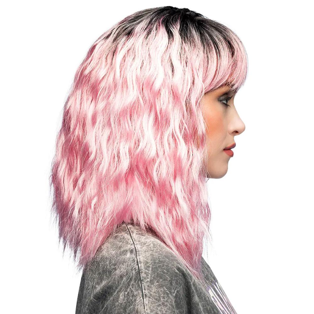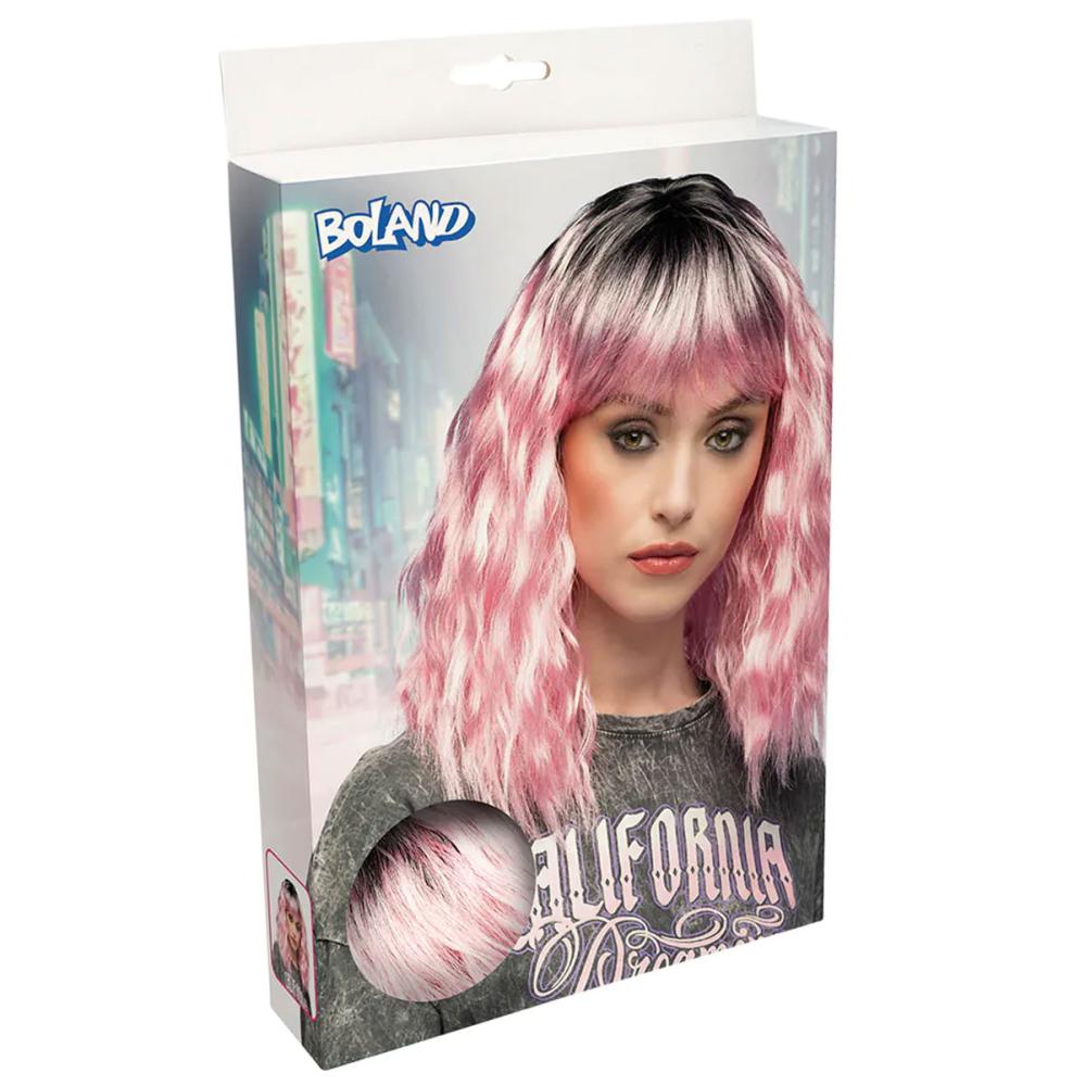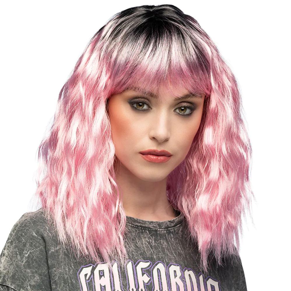 Bølget Paryk Lyserød/Sort omfatter en skulderlang paryk med bølget hår og pandehår i lyserød og sort.