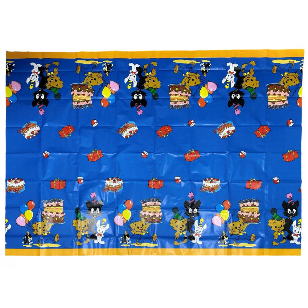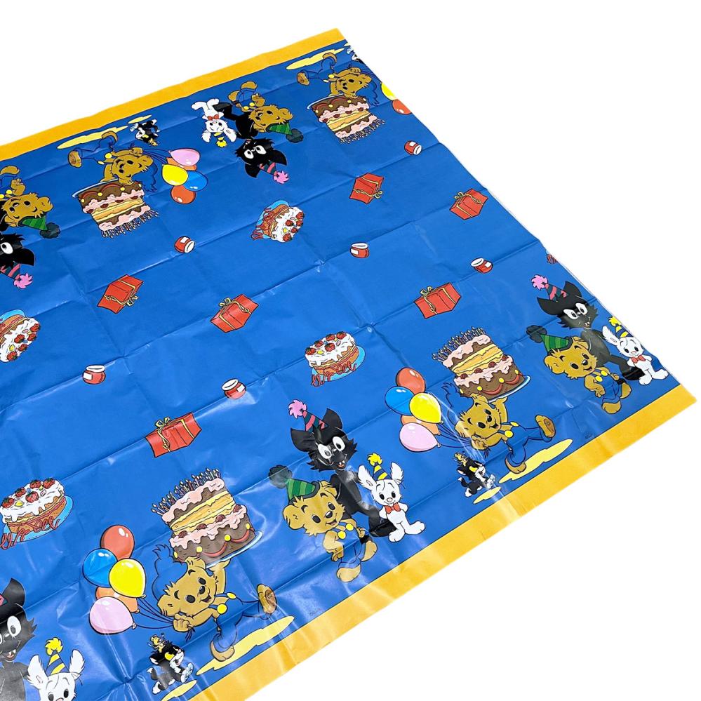 Borddug Bamse omfatter en blå borddug med gule striber langs siderne og motiver af Bamse, Lille Skutt og Vargen sammen med fødselsdagskager, gaver, balloner og honningkrukker.