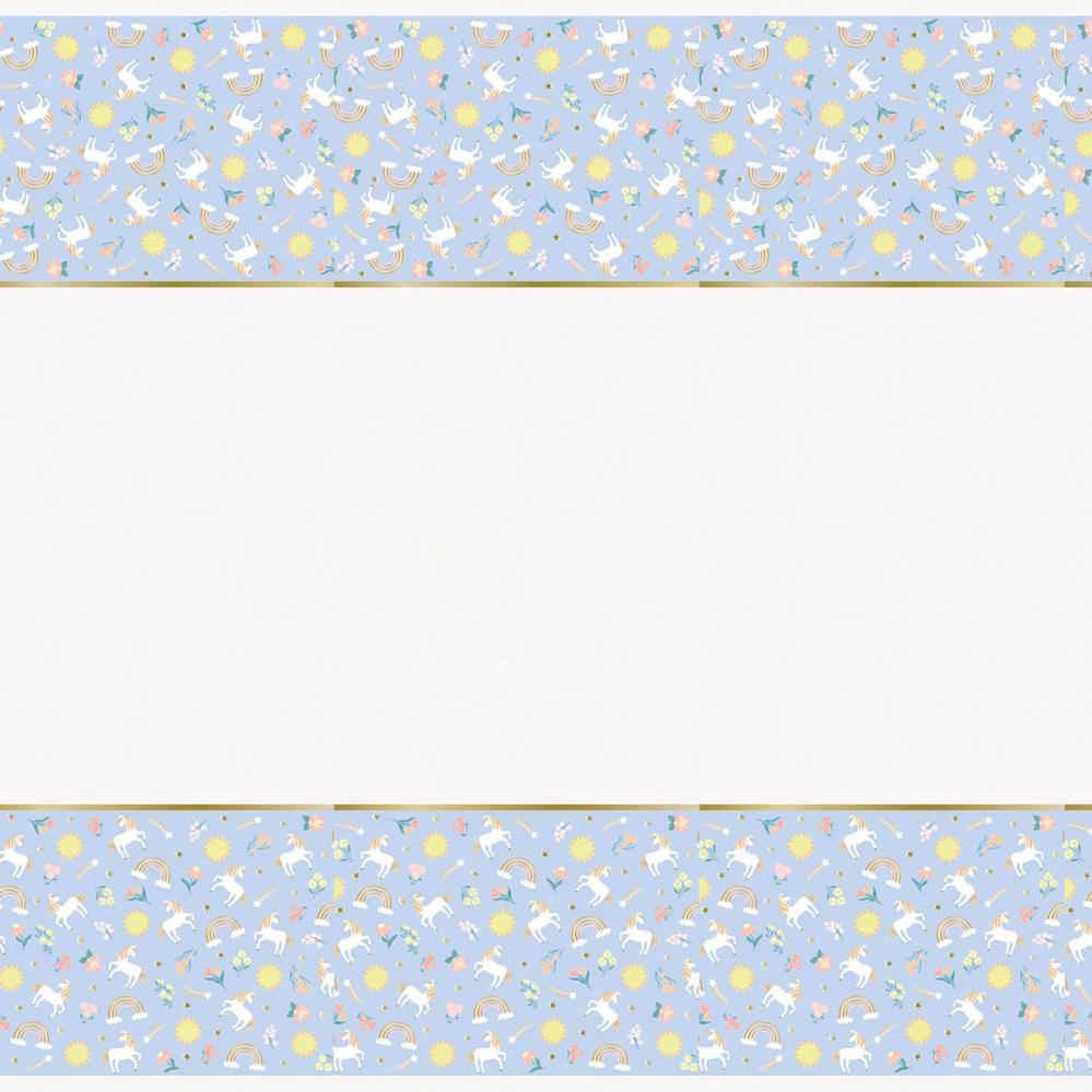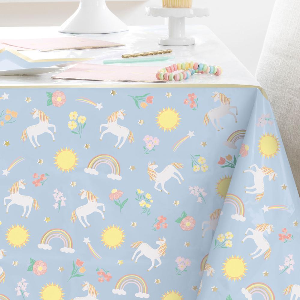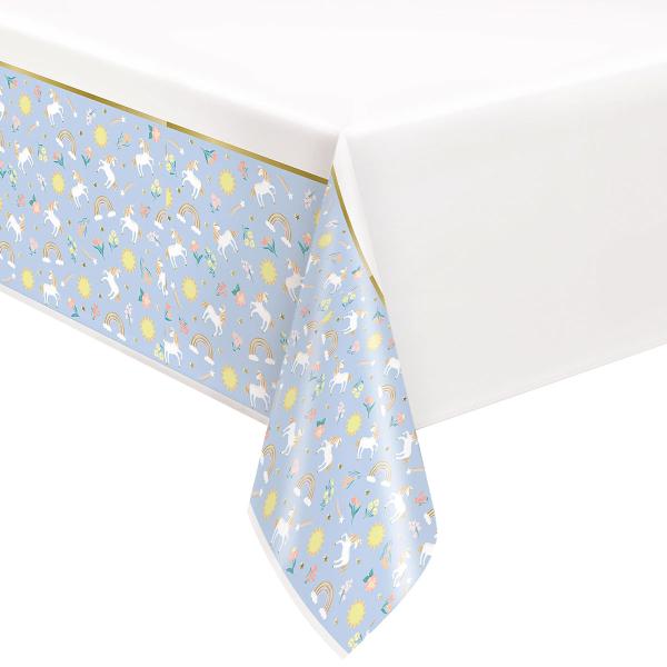 Borddug Enhjørning 213 x 137 cm er en borddug med motiv af hvide enhjørninger, flerfarvede blomster, regnbuer, sole og guldfarvede stjerner mod en lyseblå baggrund.