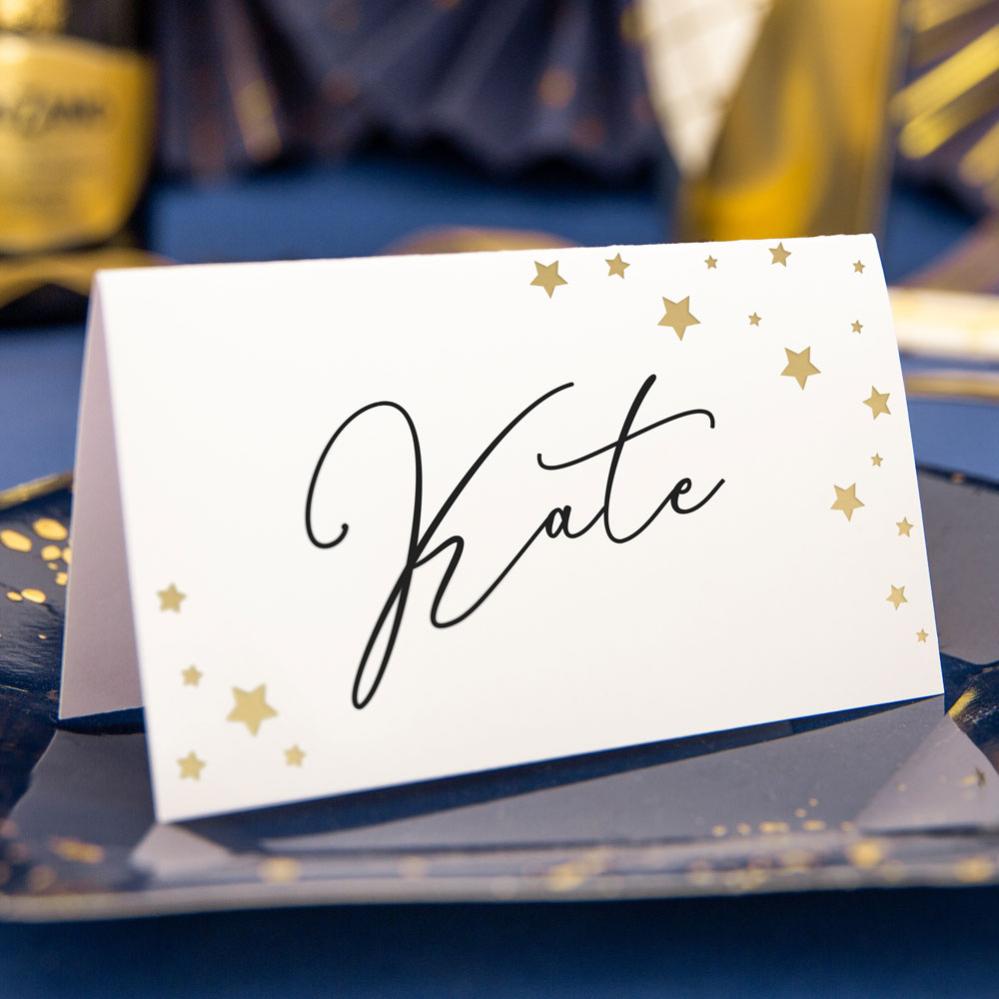 Bordkort Stjerner inkluderer en pakke med 10 hvide bordkort med guldstjerne-motiver. Kortene er lavet af pap og er ca. 5,5 cm høje og 9,5 cm brede, når de er foldet på midten.
