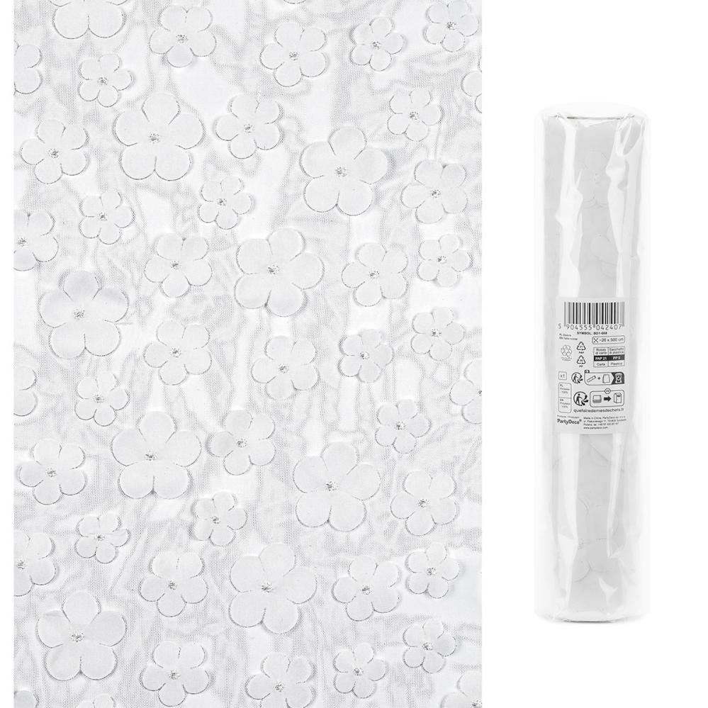 Bordløber Blomster Hvid omfatter en hvid bordløber af netstof med blomstermønster.