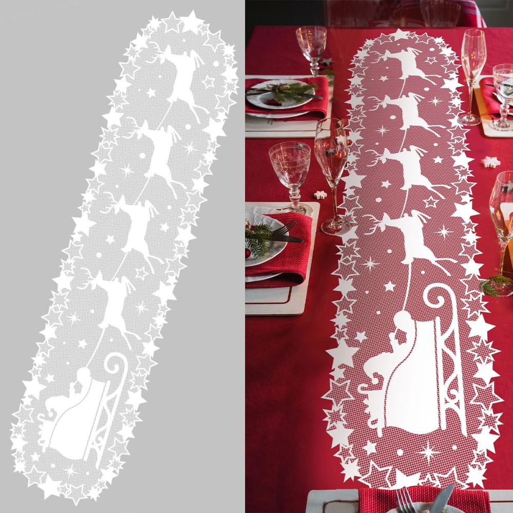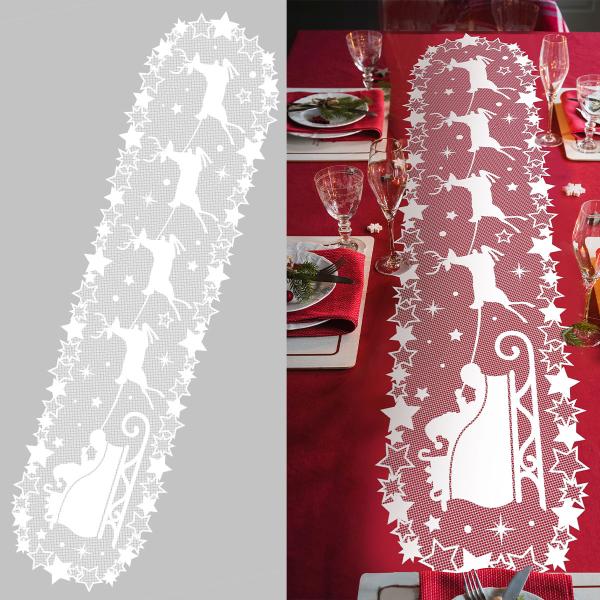 Bordløber Julemandens Kane omfatter en dekorativ hvid bordløber med netstofdetaljer, stjerner rundt i kanten og et julemotiv, der forestiller julemanden i sin kane, som trækkes af fire rensdyr.