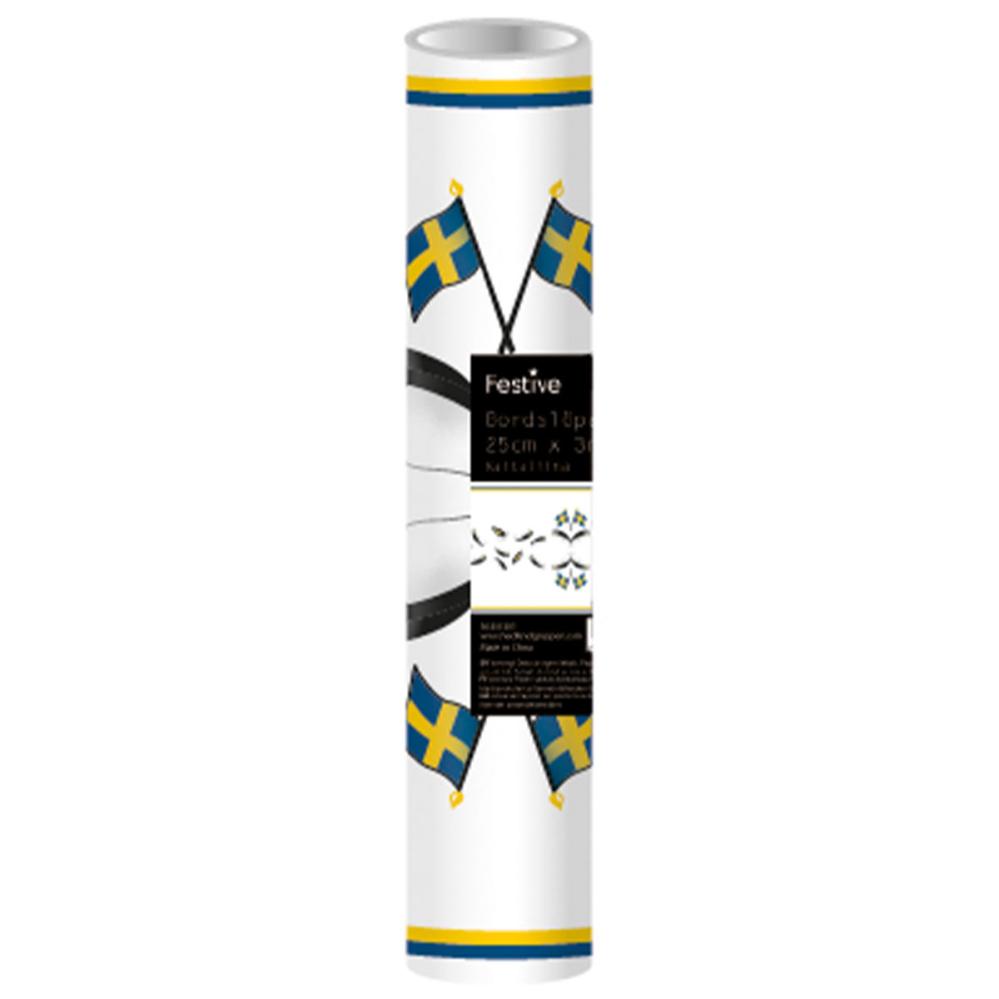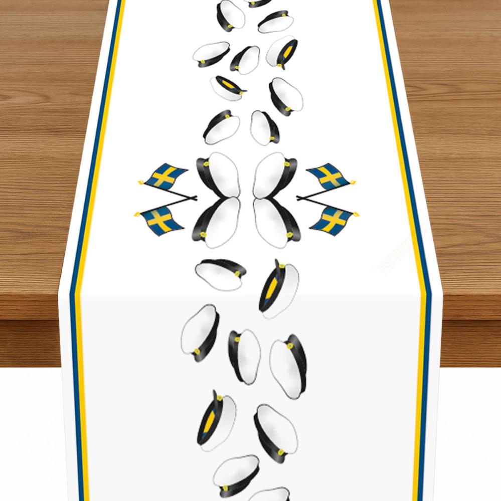 Bordløber Studenten omfatter en hvid bordløber med tryk af studenterhuer, svenske flag samt blå og gule striber langs siderne.