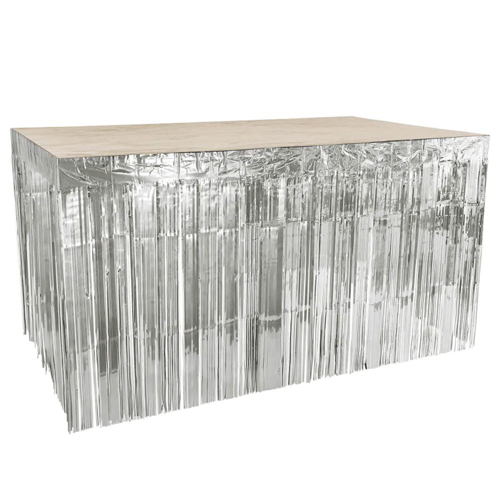 Bordskørt Frynser Metallic Sølv 300x74 cm omfatter en bordskjole med skinnende frynser i metallic sølv.