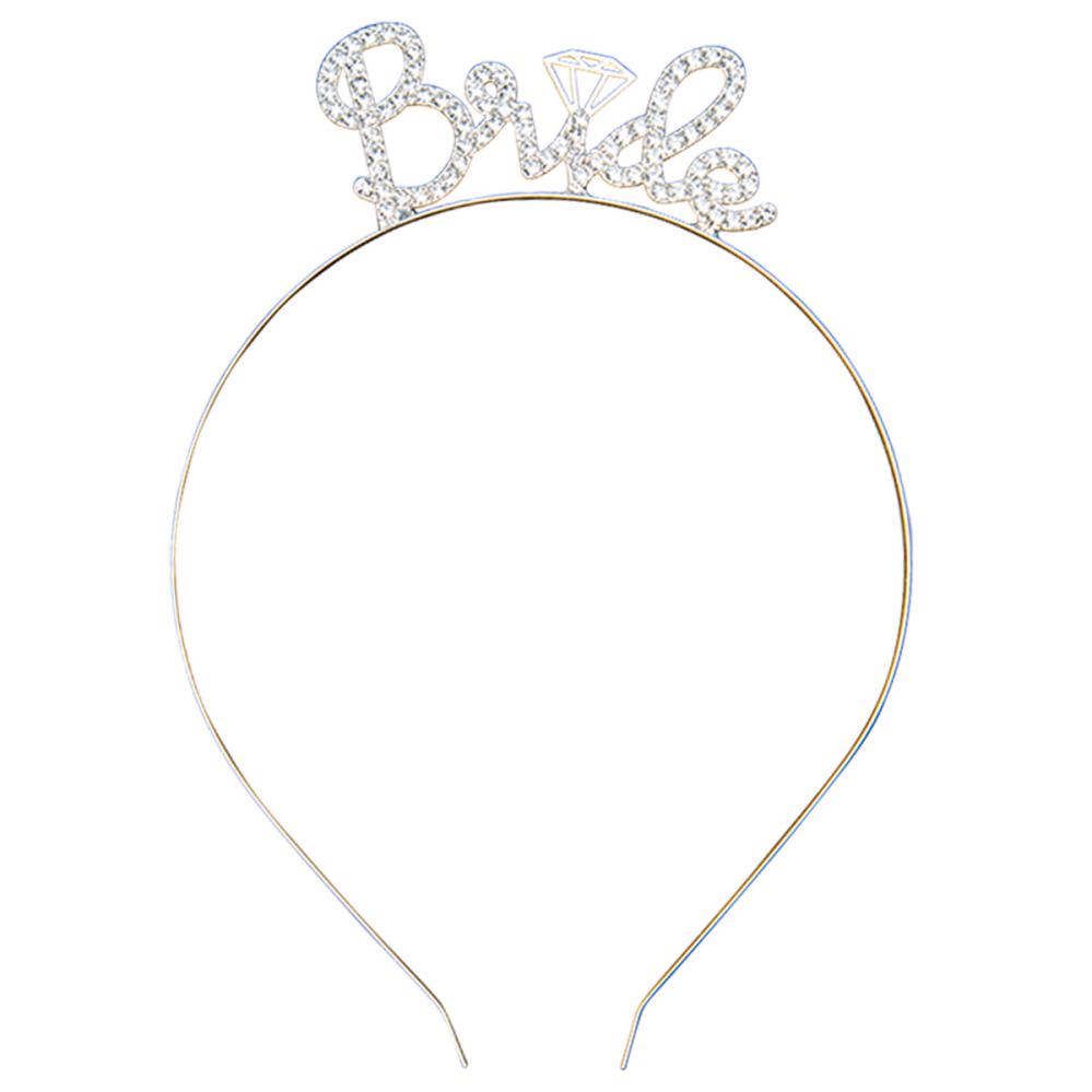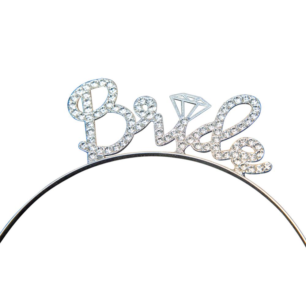 Bride Hårbøjle Sølv omfatter en sølvfarvet metalhårbøjle med motiv af teksten "Bride", som er udsmykket med små plastdiamanter.