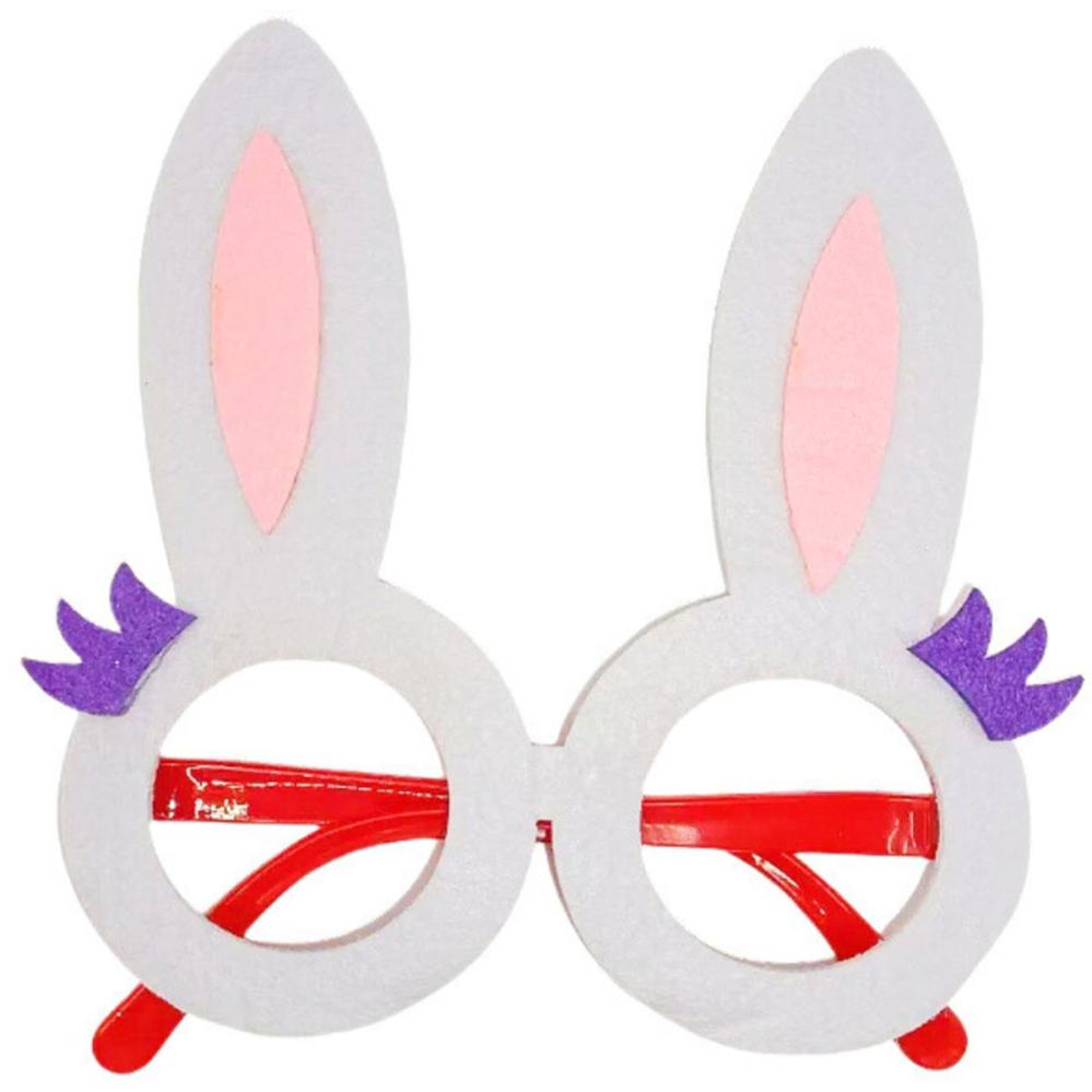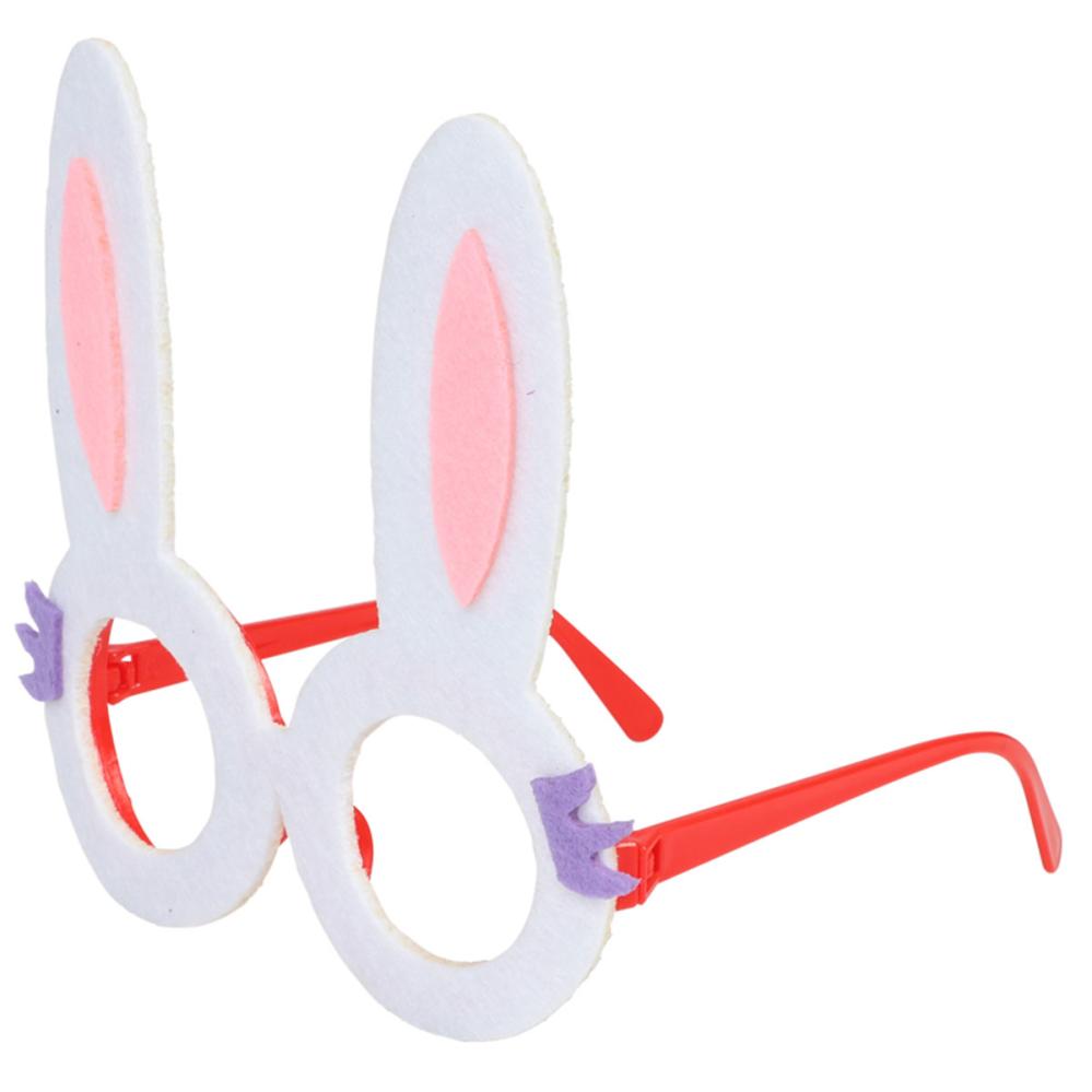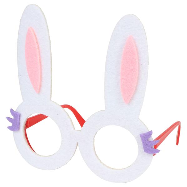 Briller Kaninører 14x15 cm er et par briller uden linser med et rødt stel i plast og fastgjort filt med opstående kaninører i hvid, rosa og lilla.