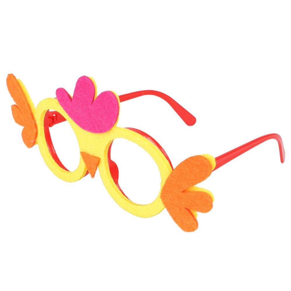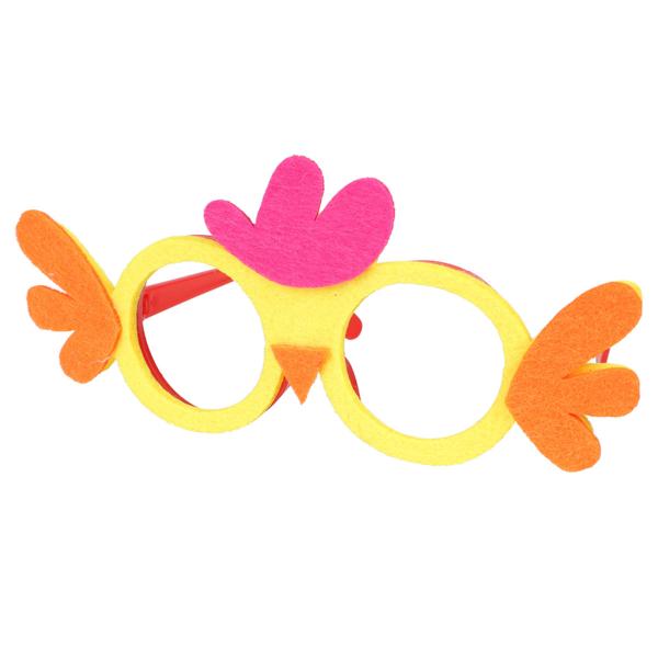 Briller Kylling 18x8 cm er et par briller uden glas med en rød indfatning i plast med fastgjort filtstof foran i form af en kylling i gul, violet og orange.