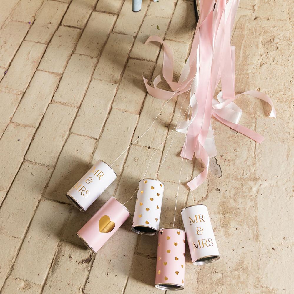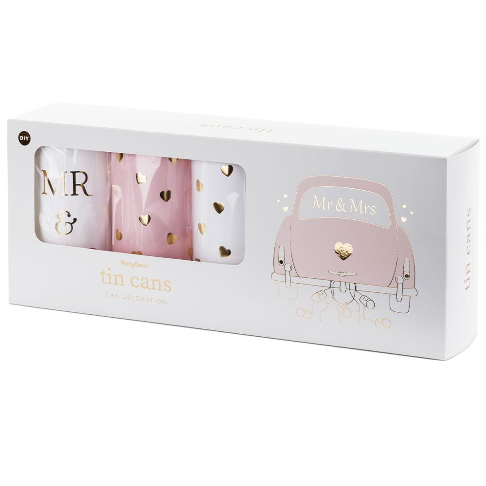 Bryllupsdåser Mr & Mrs indeholder fem dåser med etiketter i rosa og hvid, dekoreret med guldfarvede hjerter eller teksten "MR & MRS". Dåserne skramler festligt, når de slæbes efter bilen eller cyklen, og er nemme at montere med de hvide snore og det lys rosa silkebånd, som medfølger.