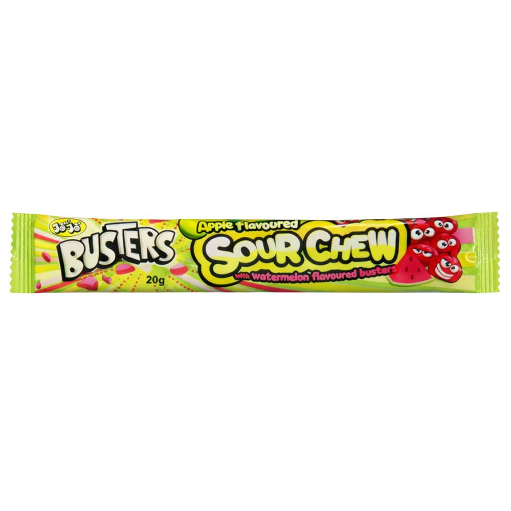 Busters Sour Chew Apple & Watermelon 20g er en tygbar slikkepind med syrlig smag af æble, dækket af små vandmelonsmagende Busters, som giver en herlig kombination af seje og sprøde konsistenser.